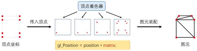 如上图,顶点着色器会先将坐标转换完毕,然后由GPU进行图元装配,有多少顶点,这段顶点着色器程序就运行了多少次。