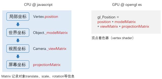 这就是应用了矩阵matrix,将三维世界坐标转换成屏幕坐标,这个矩阵叫投影矩阵,由javascript传入,至于这个matrix怎么生成,我们暂且不讨论。